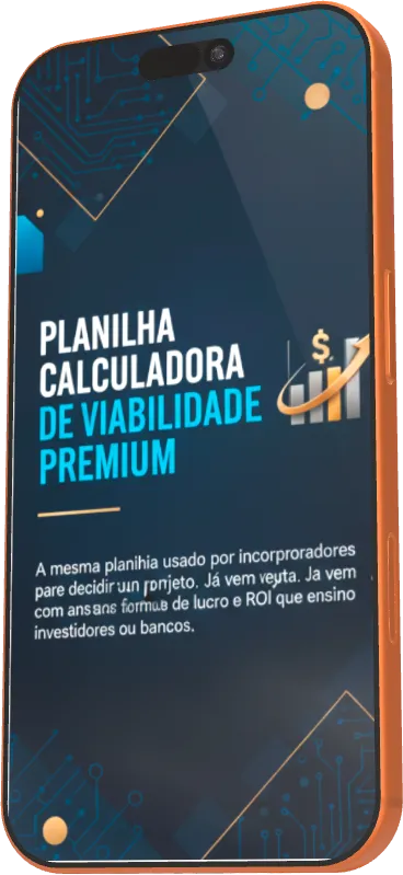 A mesma planilha usada por incorporadores para decidir se entram ou não em um projeto. Já vem configurada com as mesmas fórmulas de lucro e ROI que ensino no eBook, com visual executivo para você apresentar a investidores ou bancos.